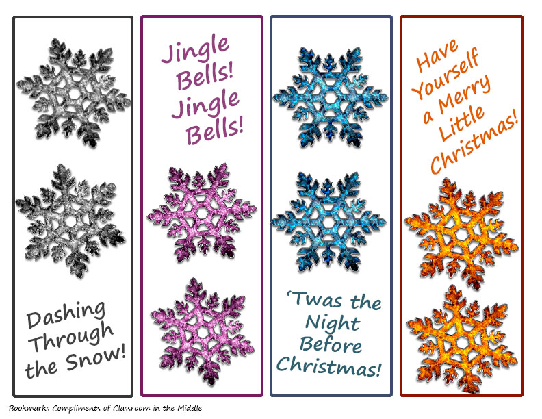 When I saw these pretty snowflakes, I decided to skip the traditional Christmas colors for my bookmarks this year. So no red and green this time! Instead, here are bookmarks for your kiddos in silver, purple, aqua, and orange. You can download your copy at the end of this article.