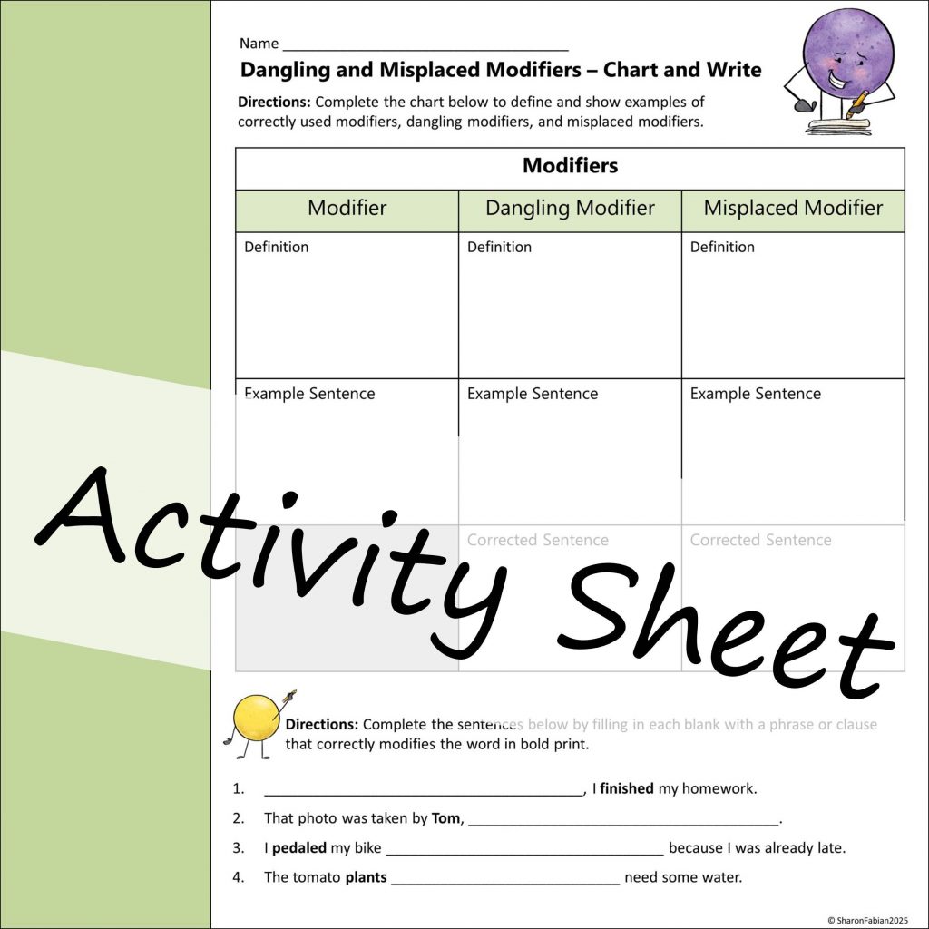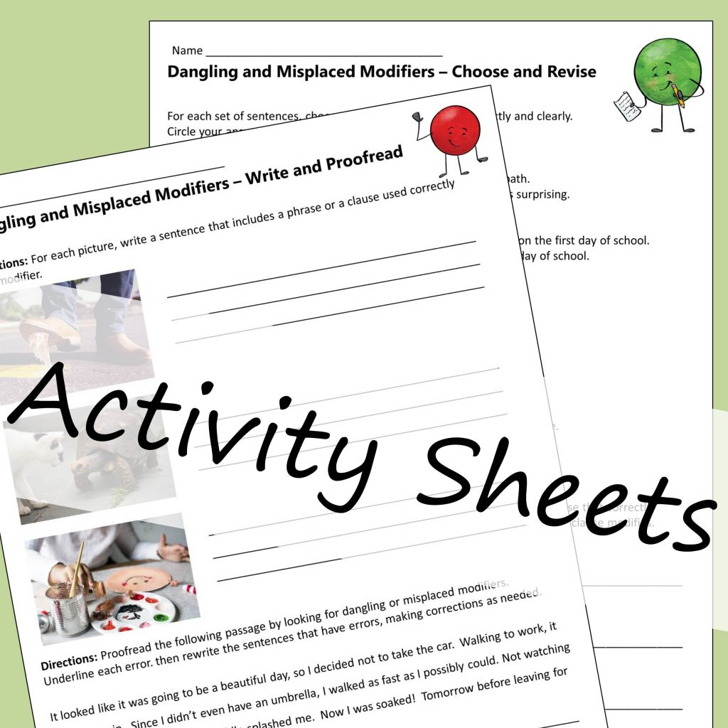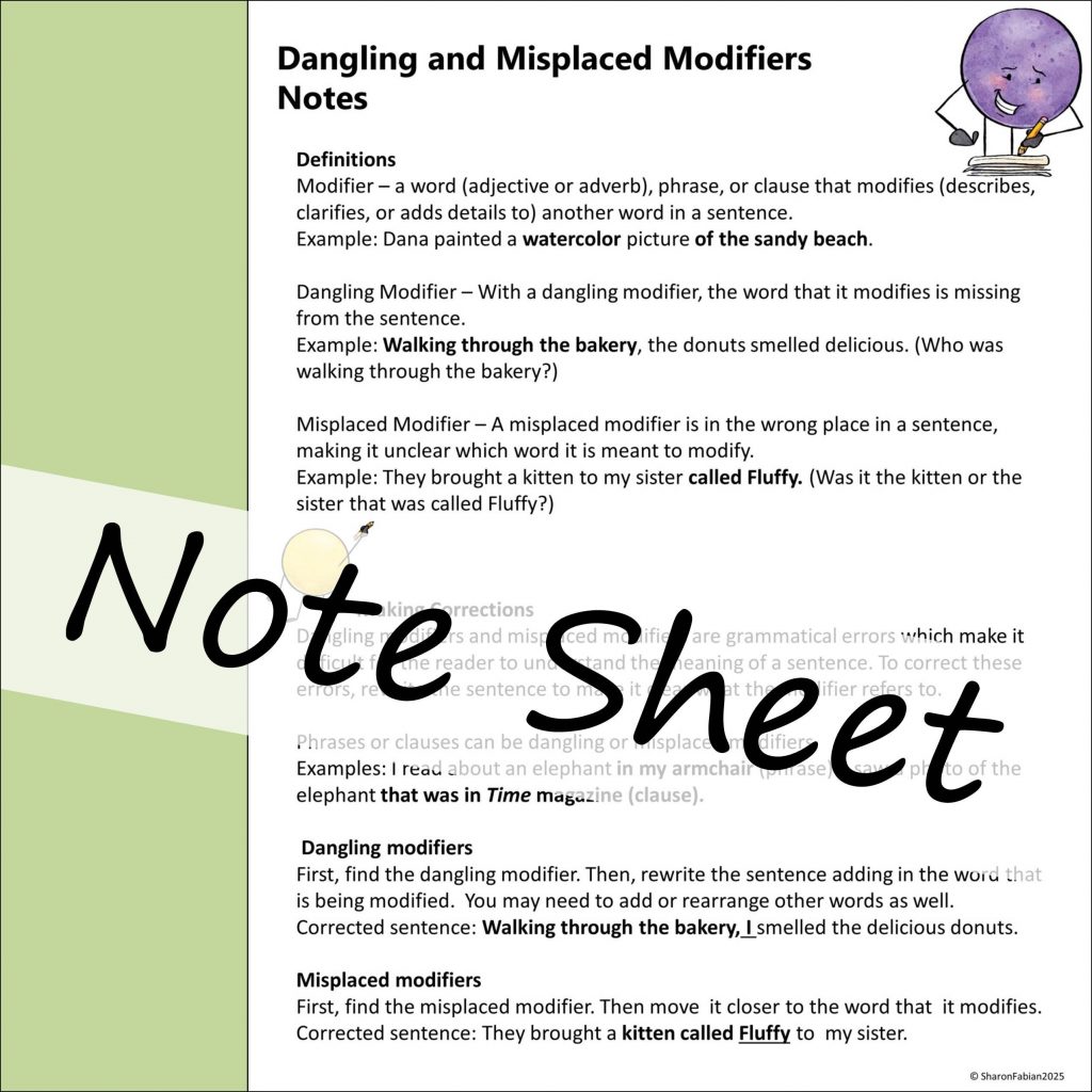 And right here, you can see what one of the resources looks like. This is the note sheet and the three activity sheets for dangling and misplaced modifiers.