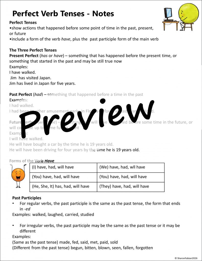 These Notes and Practice Sets are small, inexpensive resources with just enough material to teach one particular objective. Each one includes a page of notes and three practice sheets. Here are images of the notes and the practice pages for perfect verb tenses.