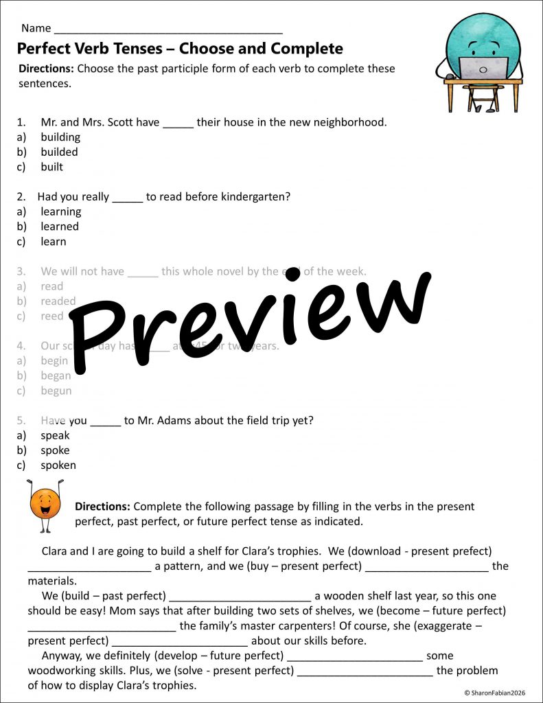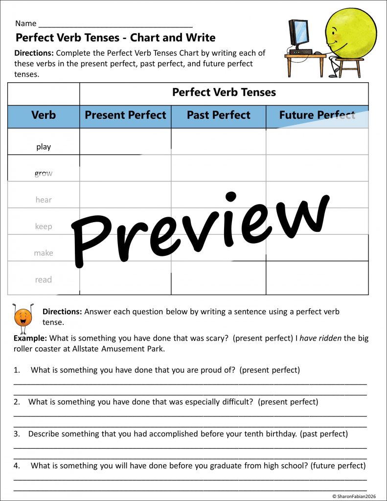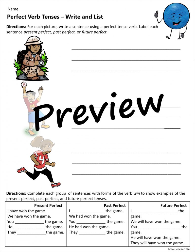 Here’s one more idea. After your kids have learned what they need to know about verb tenses, informally evaluate what they have learned with a quick game in which you present one verb, and then have kids draw two cards, one that says either present, past, or future, and one that says either simple, continuous, or perfect. Then, the students must give the correct form of the verb to match the two cards that they drew. Of course, the game could be modified as needed according to the number of tenses they have learned.