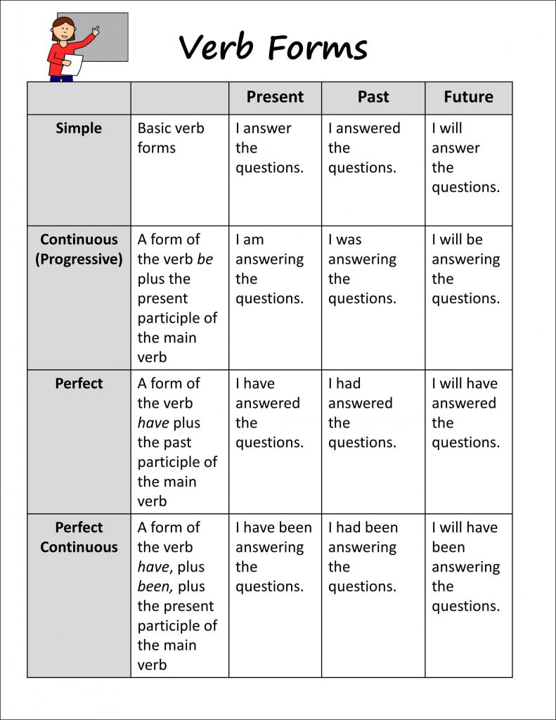 There are past, present, and future time frames, each in four different modes (called “aspects”) – simple, continuous (also called progressive), perfect, and perfect continuous.